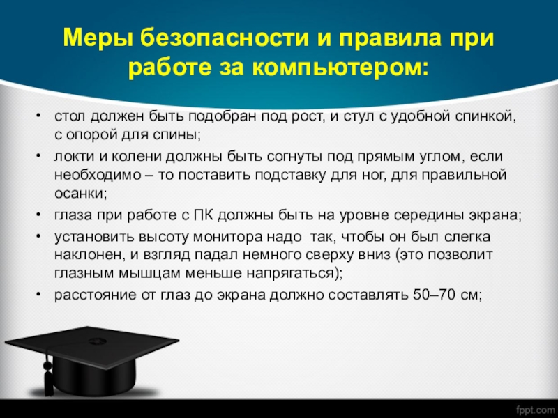 Слайд 25Меры безопасности и правила при работе за компьютером: