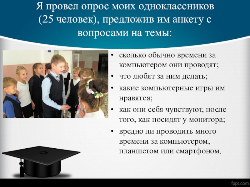 2) при помощи опроса/анкетирования выяснить, сколько времени, и на какие виды занятий, тратят мои одноклассники ежедневно, и в течение недели за компьютером, планшетом или смартфоном;