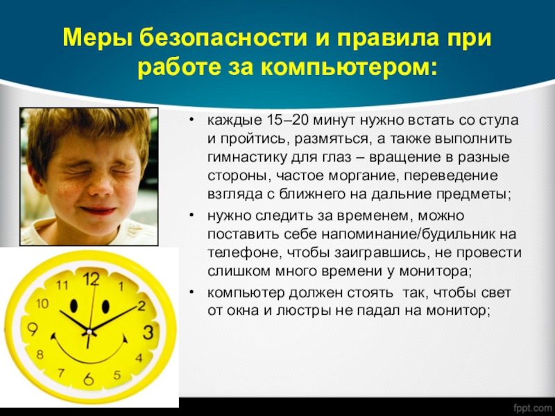 Слайд 26Меры безопасности и правила при работе за компьютером: