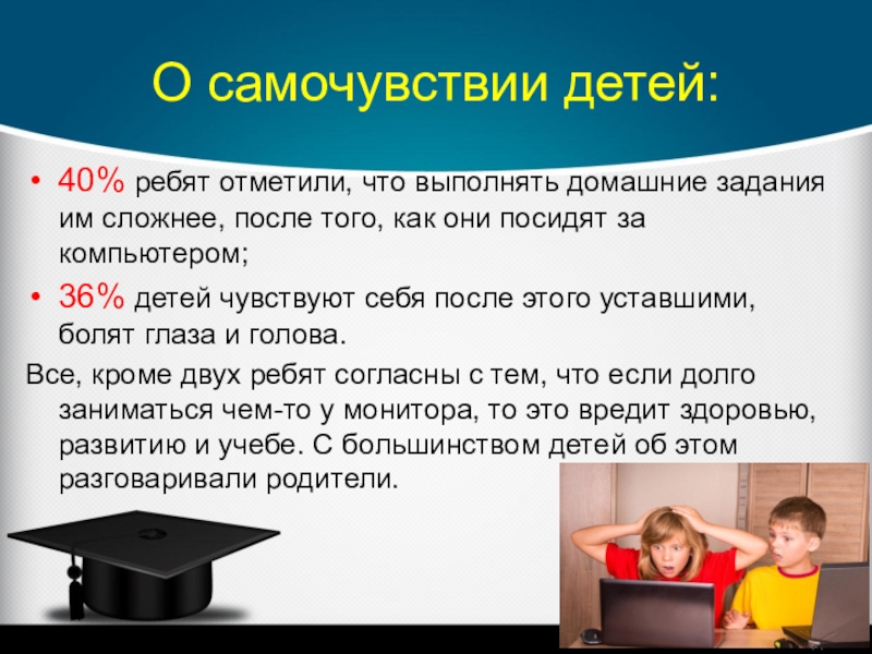 36% детей чувствуют себя после этого уставшими, болят глаза и голова.