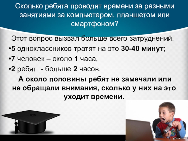 Слайд 19Сколько ребята проводят времени за разными занятиями за компьютером, планшетом или