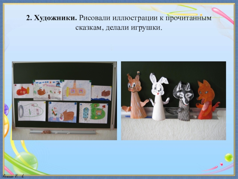 Слайд 92. Художники. Рисовали иллюстрации к прочитанным сказкам, делали игрушки.