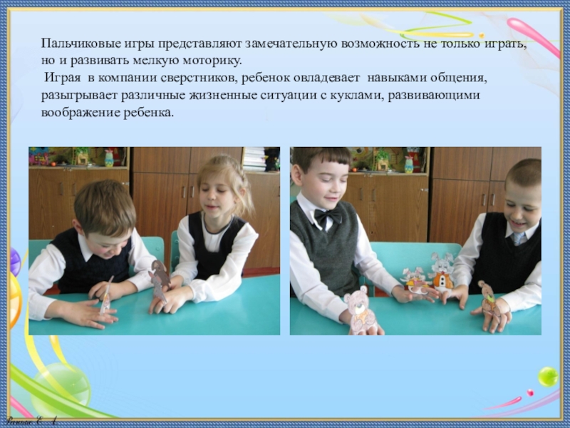 артистические способности, знакомят с множеством детских сказок, способствуют развитию общительности, коммуникабельности ребёнка, развивают моторику рук и пальцев, двигательную активность ребёнка.