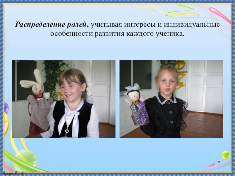 Слайд 8Распределение ролей, учитывая интересы и индивидуальные особенности развития каждого ученика.