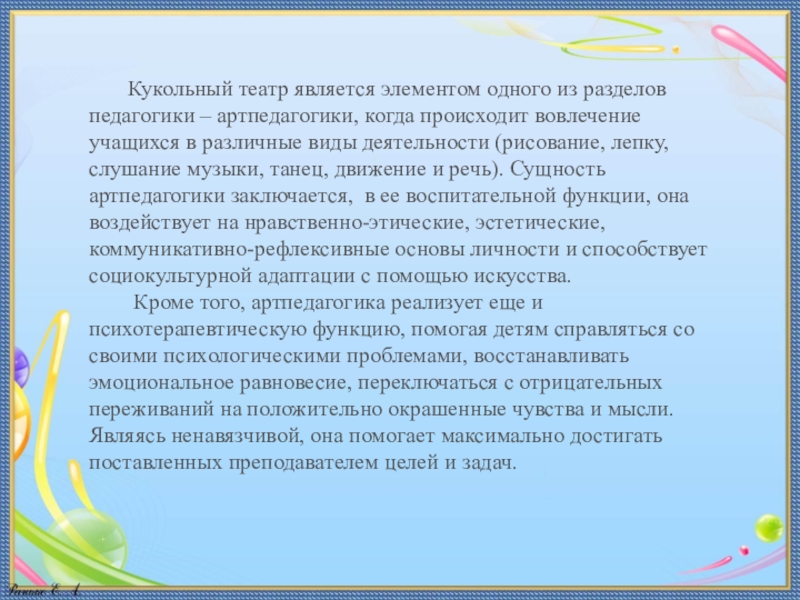 Слайд 3Кукольный театр является элементом одного из разделов педагогики – артпедагогики, когда