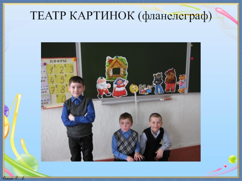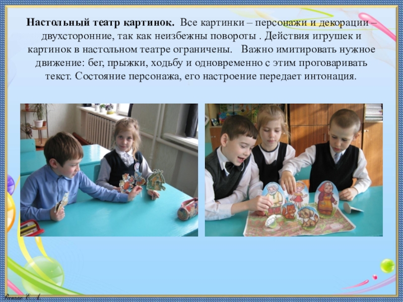 Слайд 17Настольный театр картинок. Все картинки – персонажи и декорации – двухсторонние,
