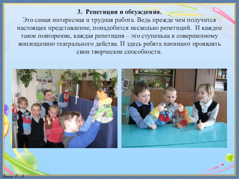 чем получится настоящее представление, понадобится несколько репетиций. И каждое такое повторение, каждая репетиция – это ступенька к совершенному воплощению театрального действа. И здесь ребята начинают проявлять свои творческие способности.