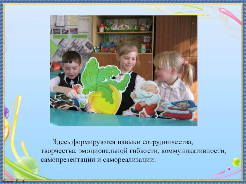 Слайд 14Здесь формируются навыки сотрудничества, творчества, эмоциональной гибкости, коммуникативности, самопрезентации и