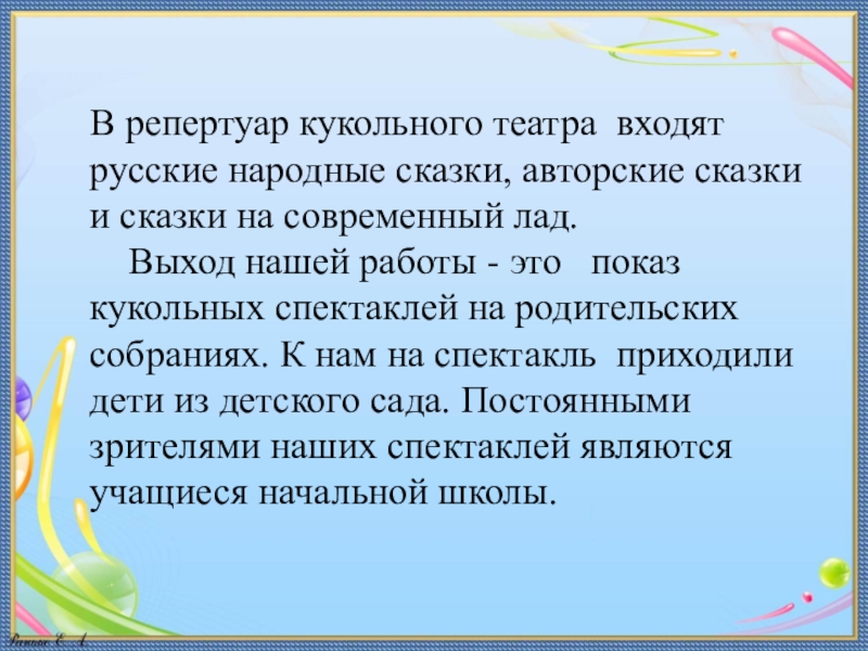Слайд 21В репертуар кукольного театра входят русские народные сказки, авторские сказки и