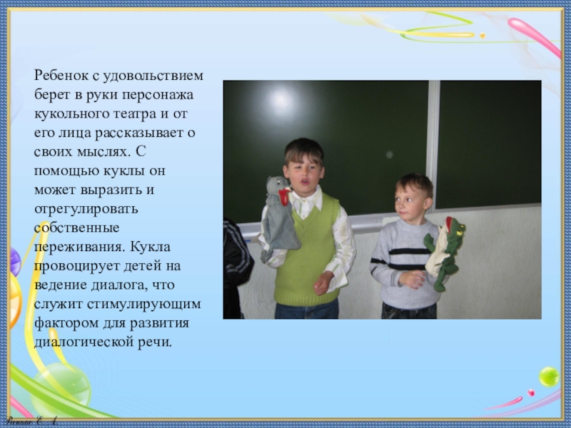 его лица рассказывает о своих мыслях. С помощью куклы он может выразить и отрегулировать собственные переживания. Кукла провоцирует детей на ведение диалога, что служит стимулирующим фактором для развития диалогической речи.