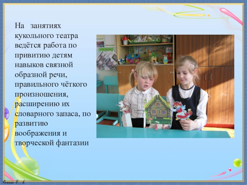 Слайд 5Занятия детей в кукольном театре развивают у детей фантазию, память, мышление,