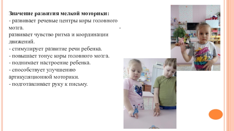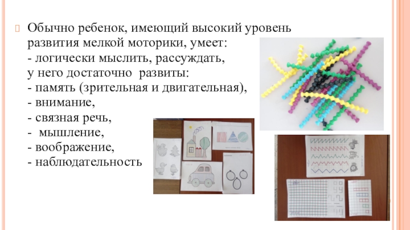 Слайд 3Обычно ребенок, имеющий высокий уровень развития мелкой моторики, умеет: