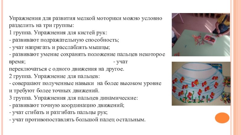 Слайд 5Упражнения для развития мелкой моторики можно условно разделить на три группы: