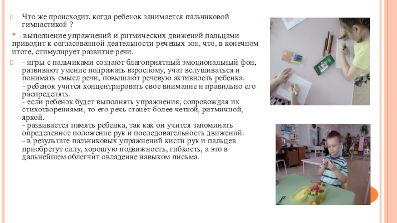 Слайд 4Что же происходит, когда ребенок занимается пальчиковой гимнастикой ?