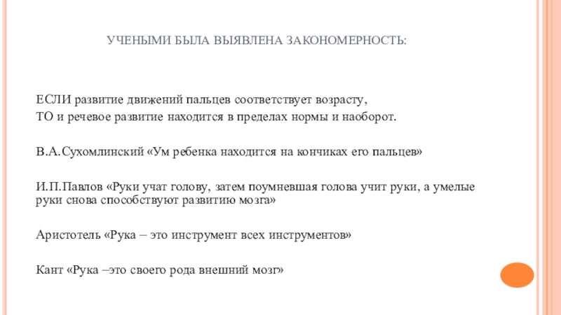 И.П.Павлов «Руки учат голову, затем поумневшая голова учит руки, а умелые руки снова способствуют развитию мозга»