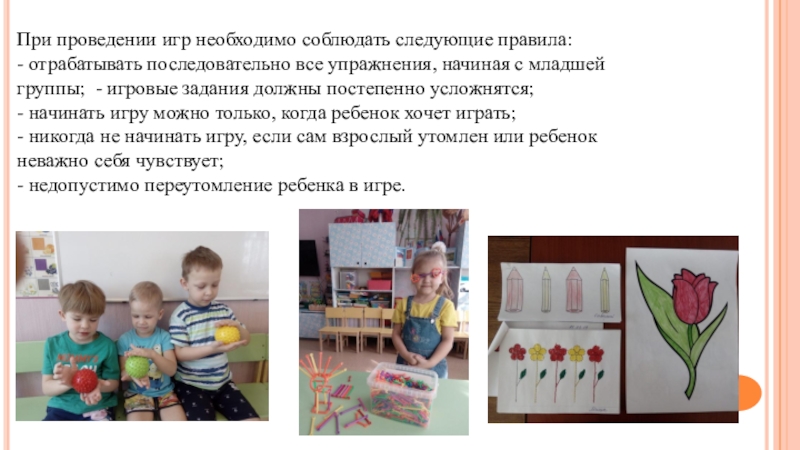 - отрабатывать последовательно все упражнения, начиная с младшей группы; - игровые задания должны постепенно усложнятся; - начинать игру можно только, когда ребенок хочет играть; - никогда не начинать игру, если сам взрослый утомлен или ребенок неважно себя чувствует; - недопустимо переутомление ребенка в игре.