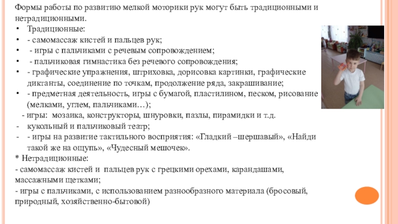 * Нетрадиционные: - самомассаж кистей и пальцев рук с грецкими орехами, карандашами, массажными щетками; - игры с пальчиками, с использованием разнообразного материала (бросовый, природный, хозяйственно-бытовой)