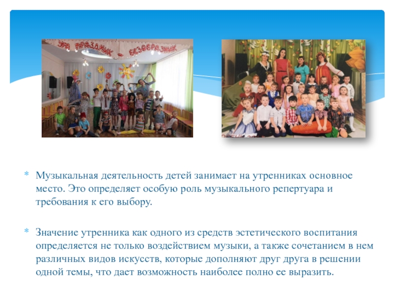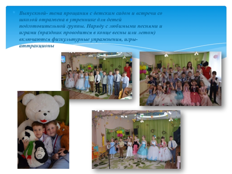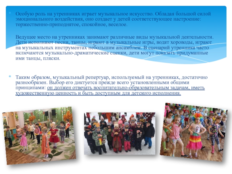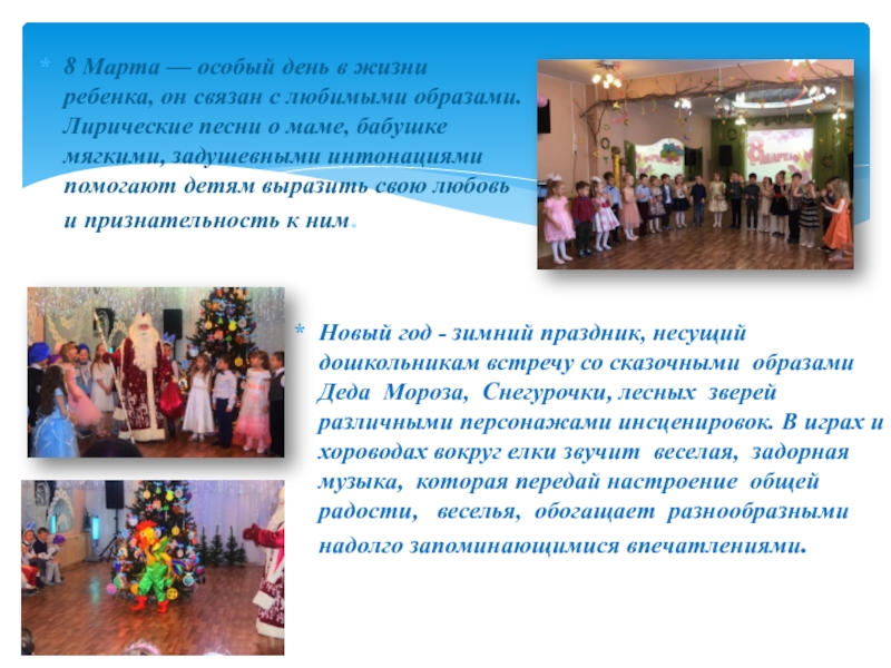 Новый год - зимний праздник, несущий дошкольникам встречу со сказочными образами Деда Мороза, Снегурочки, лесных зверей различными персонажами инсценировок. В играх и хороводах вокруг елки звучит веселая, задорная музыка, которая передай настроение общей радости, веселья, обогащает разнообразными надолго запоминающимися впечатлениями.