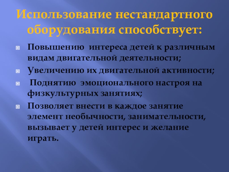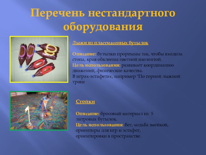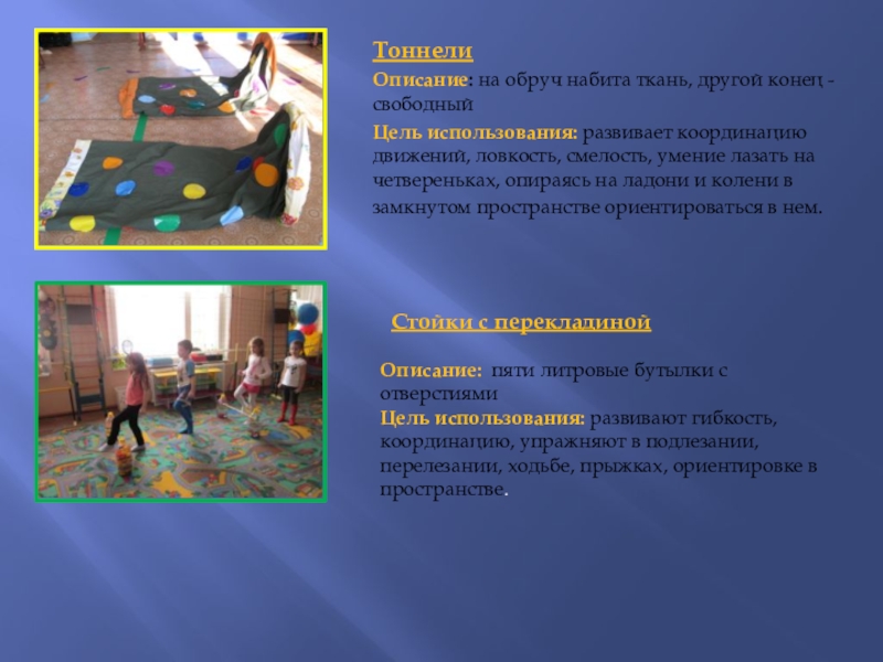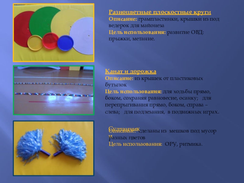 Цель использования: для ходьбы прямо, боком, сохраняя равновесие, осанку; для перепрыгивания прямо, боком, справа – слева; для подлезания, в подвижных играх.