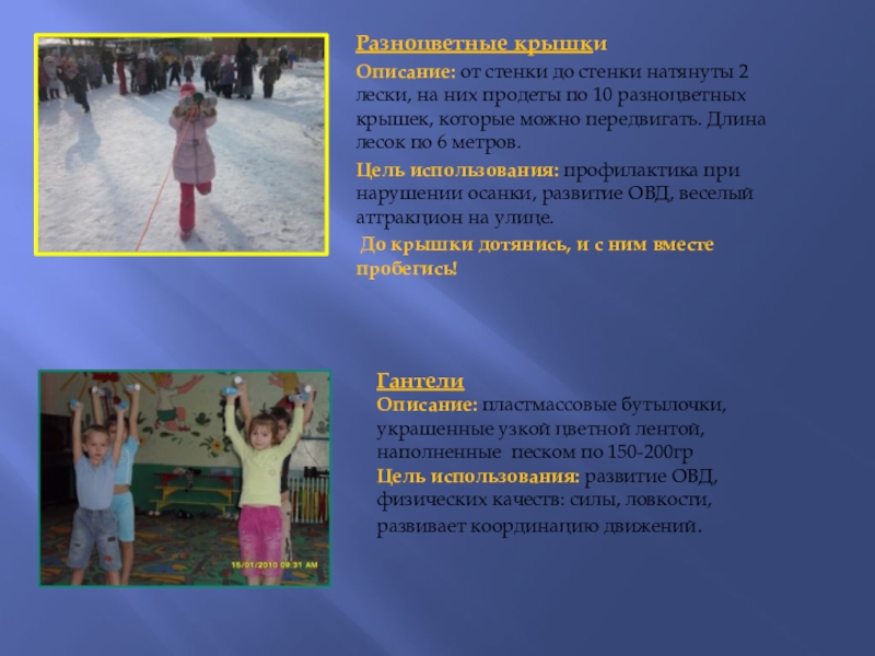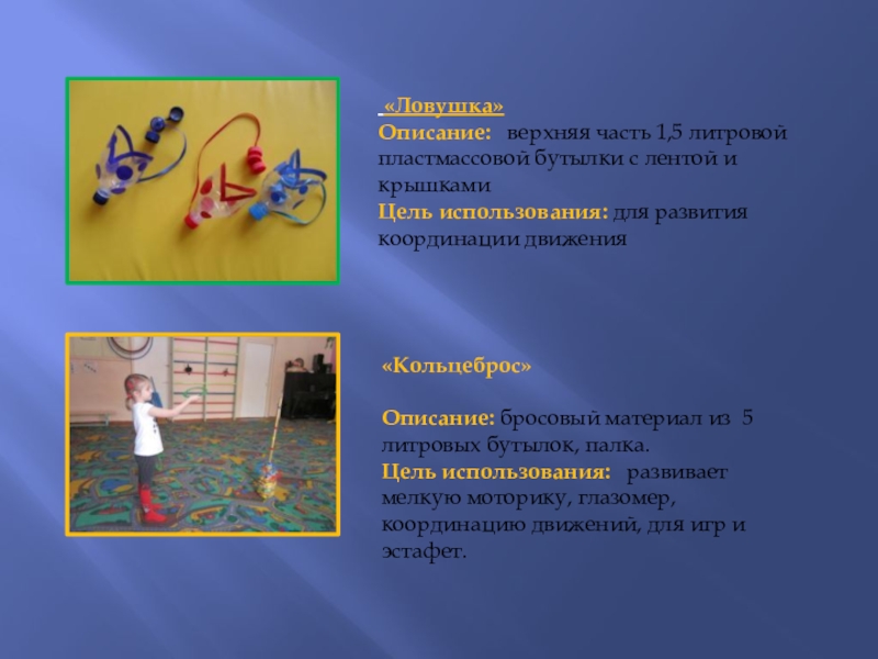 Цель использования: развитие ОВД, физических качеств: силы, ловкости, развивает координацию движений.