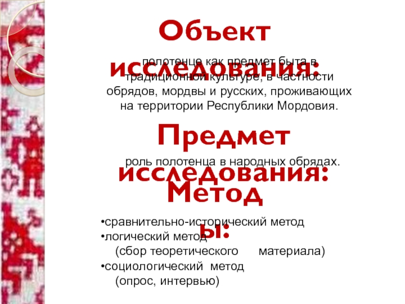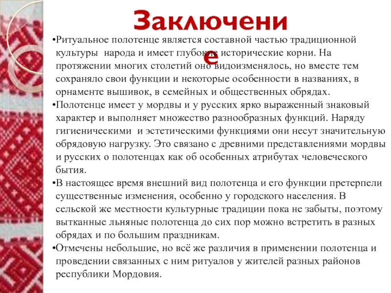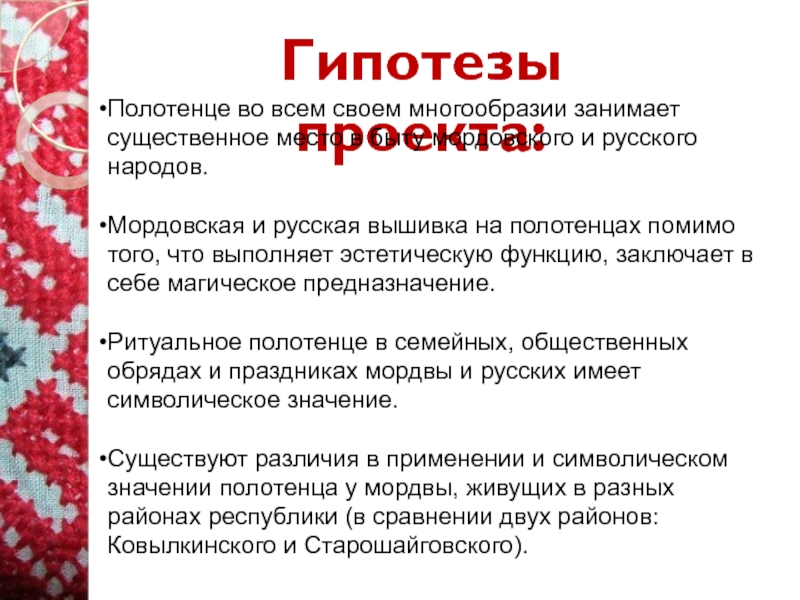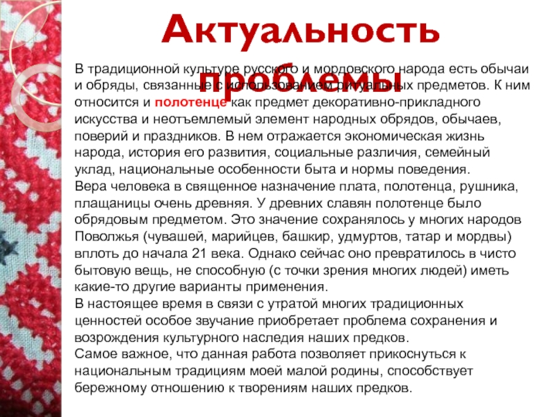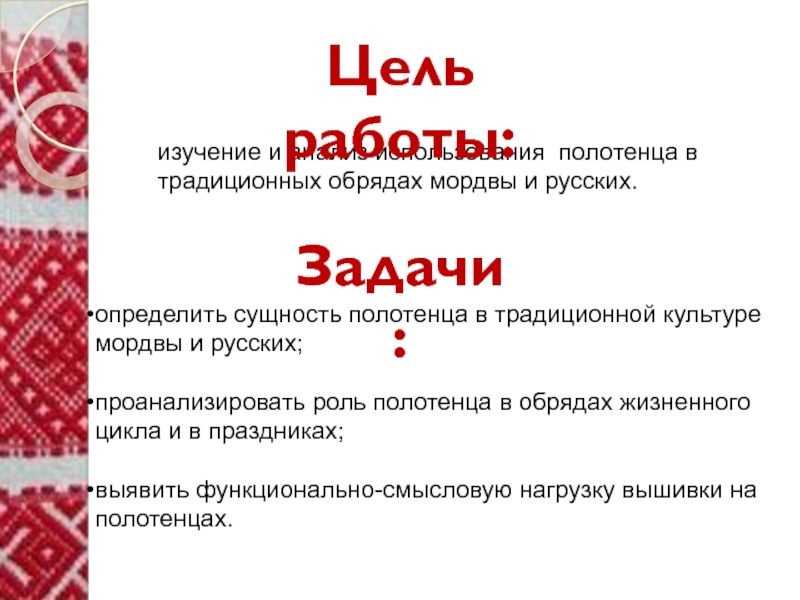 определить сущность полотенца в традиционной культуре мордвы и русских;