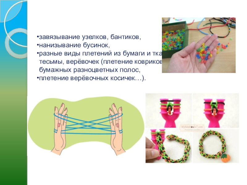 завязывание узелков, бантиков, нанизывание бусинок, разные виды плетений из бумаги и ткани, тесьмы, верёвочек (плетение ковриков из