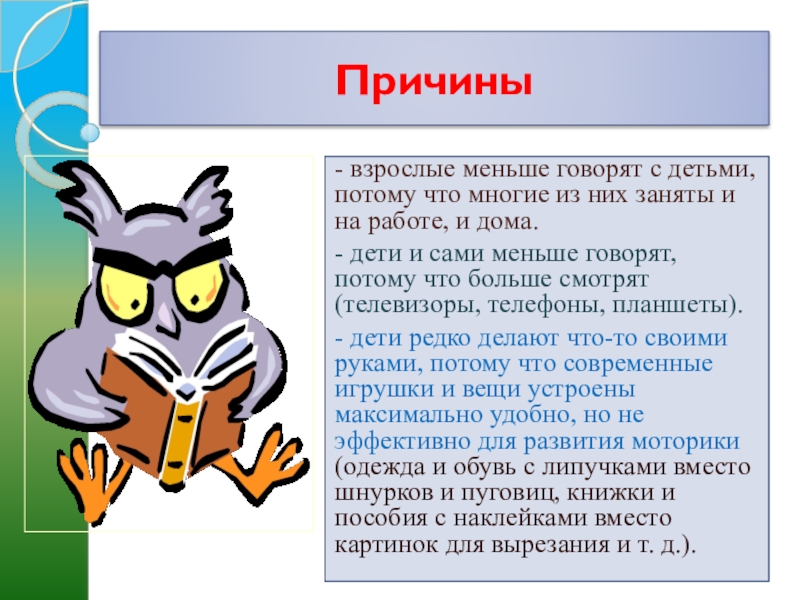 Причины- взрослые меньше говорят с детьми, потому что многие из них заняты и на работе, и дома.- дети и сами меньше говорят, потому что больше смотрят (телевизоры, телефоны, планшеты).- дети редко делают что-то своими руками, потому