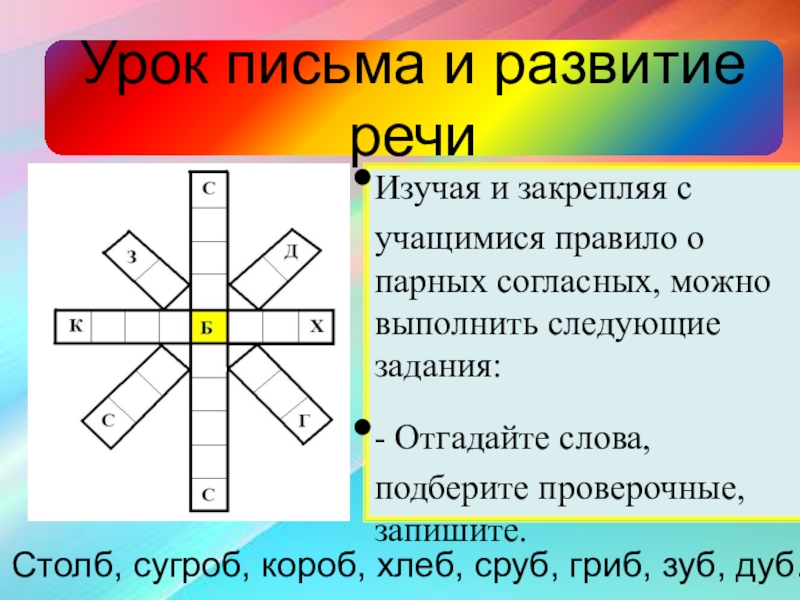 Столб, сугроб, короб, хлеб, сруб, гриб, зуб, дуб.