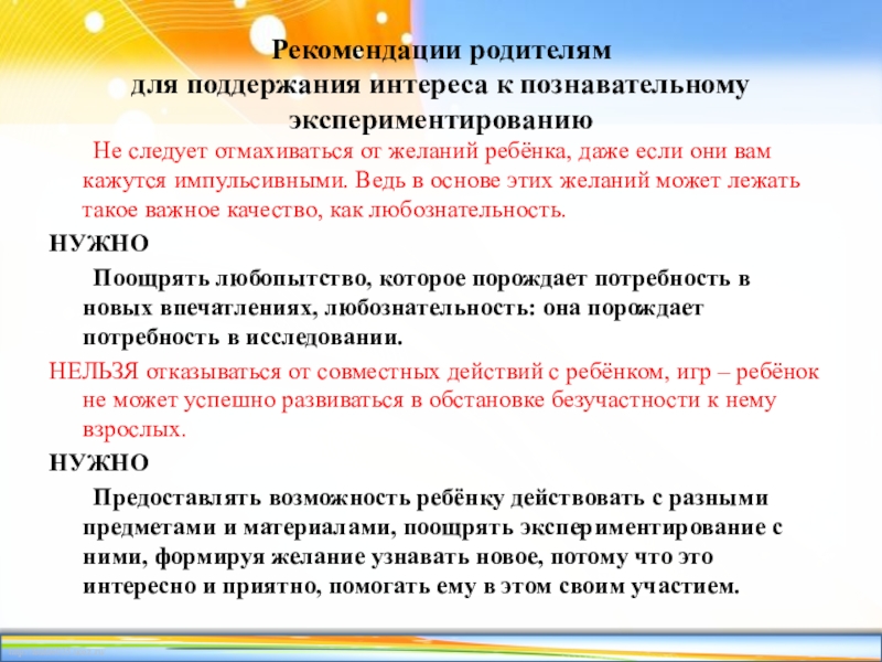 Предоставлять возможность ребёнку действовать с разными предметами и материалами, поощрять экспериментирование с ними, формируя желание узнавать новое, потому что это интересно и приятно, помогать ему в этом своим участием.