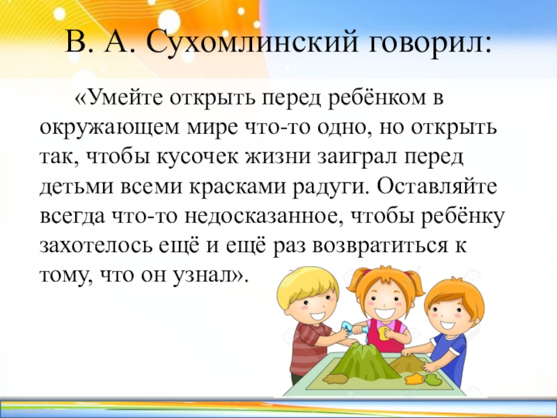 что-то одно, но открыть так, чтобы кусочек жизни заиграл перед детьми всеми красками радуги. Оставляйте всегда что-то недосказанное, чтобы ребёнку захотелось ещё и ещё раз возвратиться к тому, что он узнал».