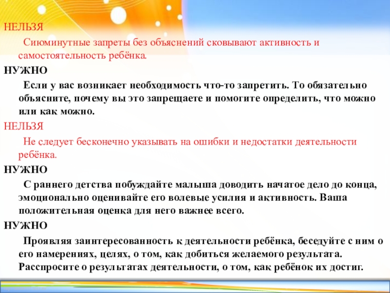 Сиюминутные запреты без объяснений сковывают активность и самостоятельность ребёнка.