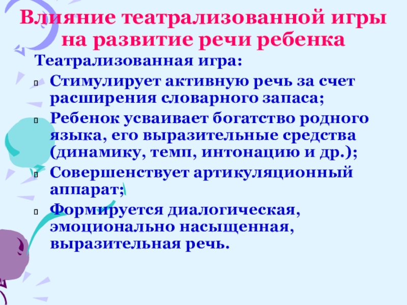 Слайд 10Влияние театрализованной игры на развитие речи ребенка