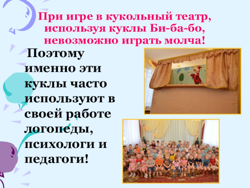 Слайд 22При игре в кукольный театр, используя куклы Би-ба-бо, невозможно играть молча!