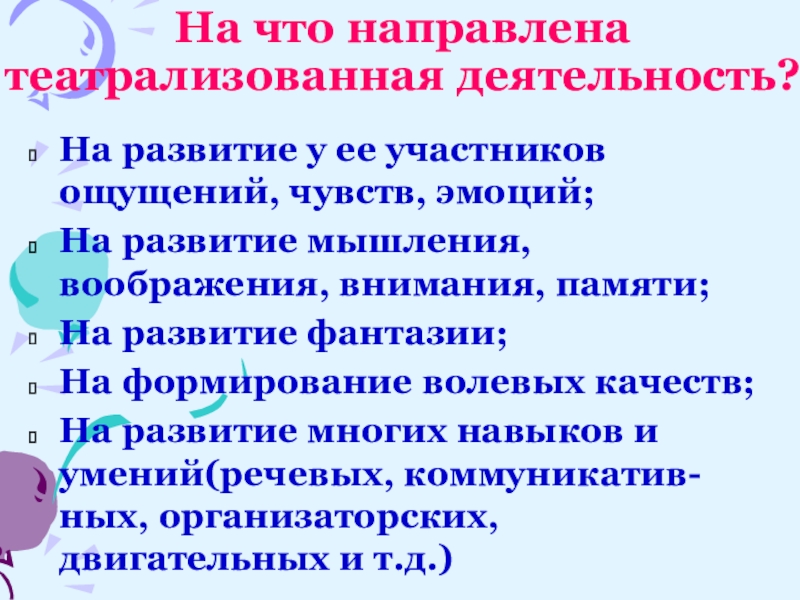 Слайд 9На что направлена театрализованная деятельность?