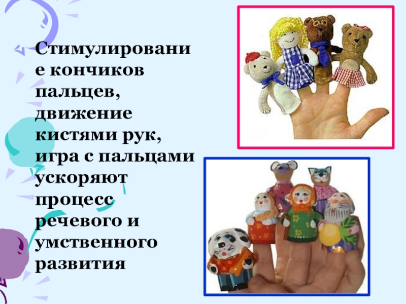 Слайд 14 Стимулирование кончиков пальцев, движение кистями рук, игра с пальцами