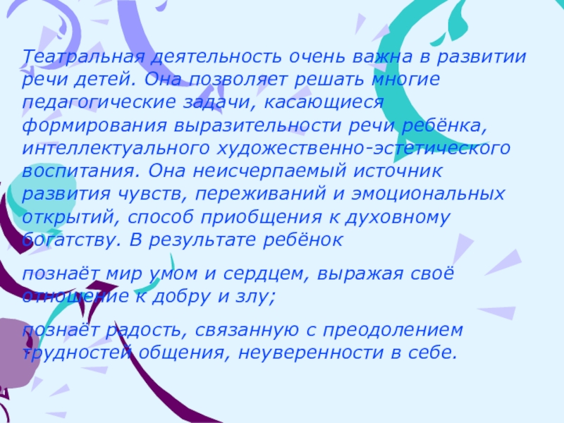 Слайд 4Театральная деятельность очень важна в развитии речи детей. Она позволяет решать
