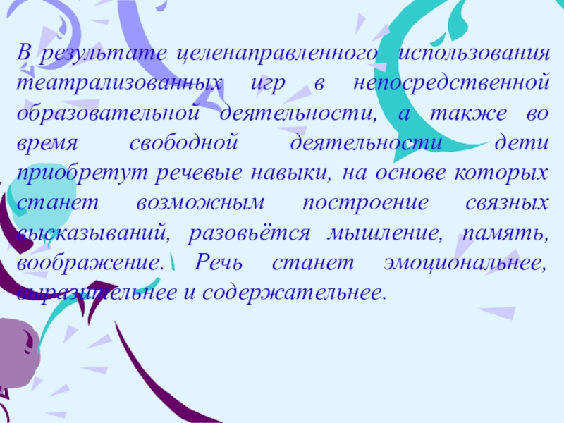 Слайд 6В результате целенаправленного использования театрализованных игр в непосредственной образовательной деятельности, а