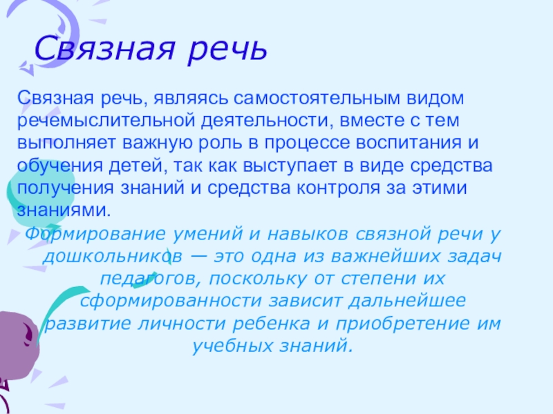 Связная речь - это особая и сложная форма коммуникативной деятельности.