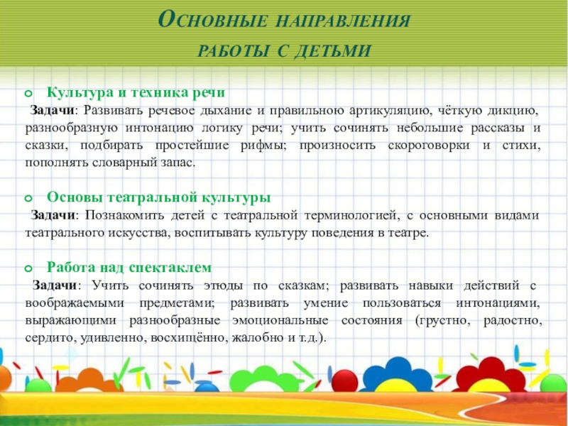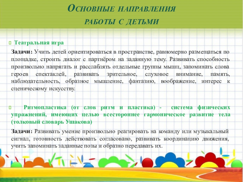 пространстве, равномерно размещаться по площадке, строить диалог с партнёром на заданную тему. Развивать способность произвольно напрягать и расслаблять отдельные группы мышц, запоминать слова героев спектаклей, развивать зрительное, слуховое внимание, память, наблюдательность, образное мышление, фантазию, воображение, интерес к сценическому искусству.