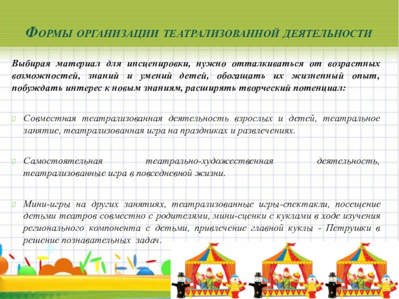 Мини-игры на других занятиях, театрализованные игры-спектакли, посещение детьми театров совместно с родителями, мини-сценки с куклами в ходе изучения регионального компонента с детьми, привлечение главной куклы - Петрушки в решение познавательных задач.