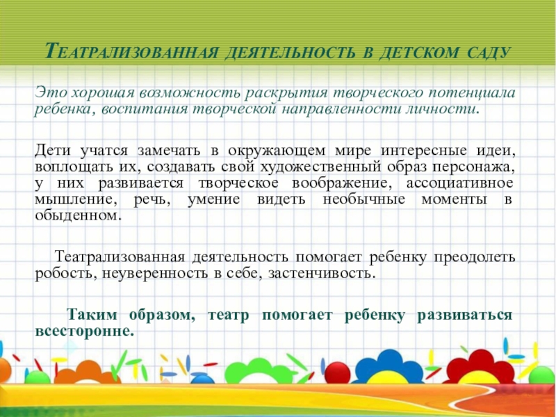 Театрализованная деятельность помогает ребенку преодолеть робость, неуверенность в себе, застенчивость.