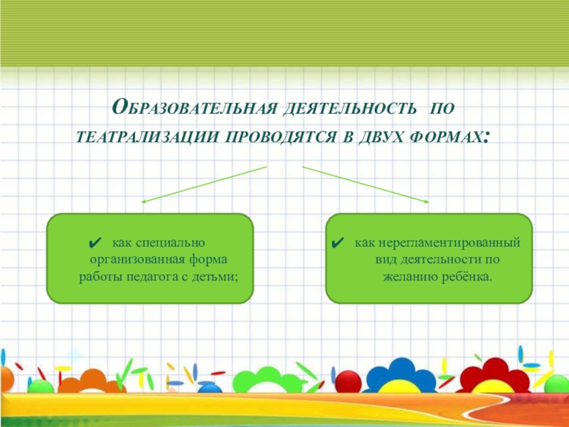 Слайд 4Образовательная деятельность по театрализации проводятся в двух формах: