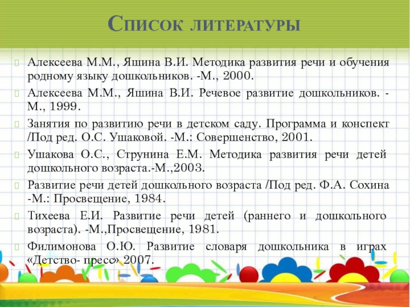 Алексеева М.М., Яшина В.И. Речевое развитие дошкольников. -М., 1999.