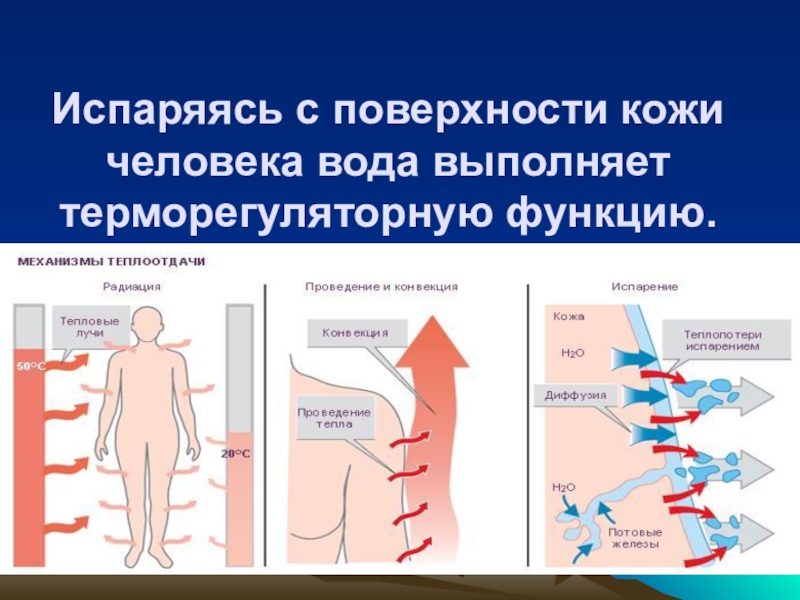 Испаряясь с поверхности кожи человека вода выполняет терморегуляторную функцию.