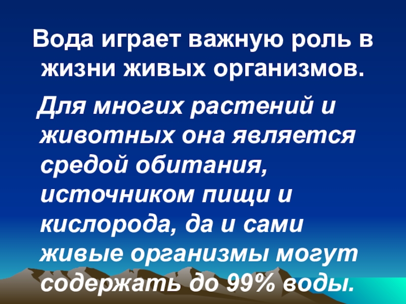 и животных она является средой обитания, источником пищи и кислорода, да и сами живые организмы могут содержать до 99% воды.