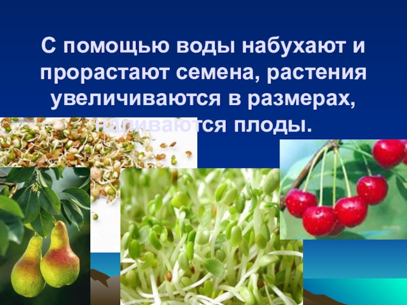Слайд 9С помощью воды набухают и прорастают семена, растения увеличиваются в размерах,