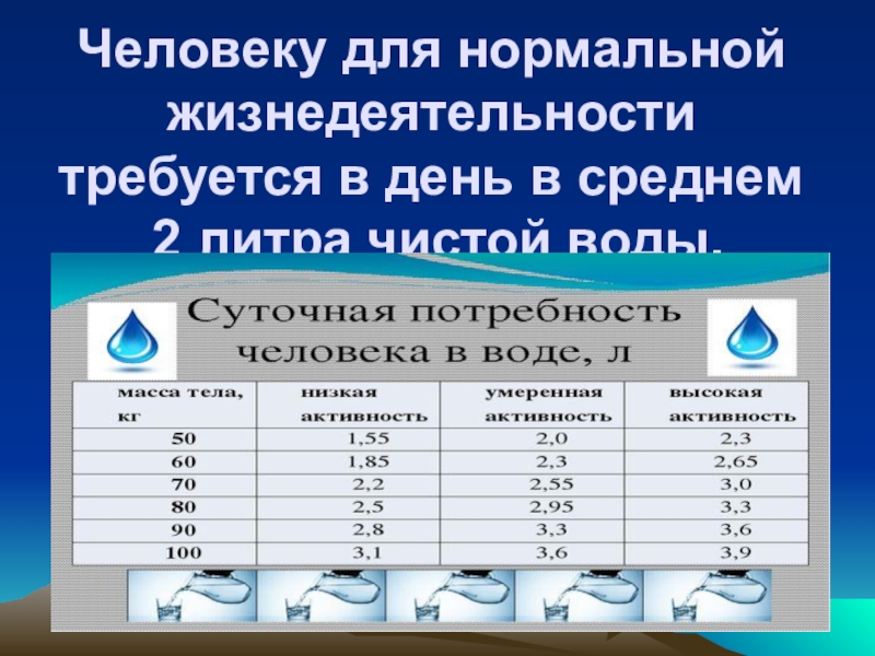 Слайд 11Человеку для нормальной жизнедеятельности требуется в день в среднем 2 литра