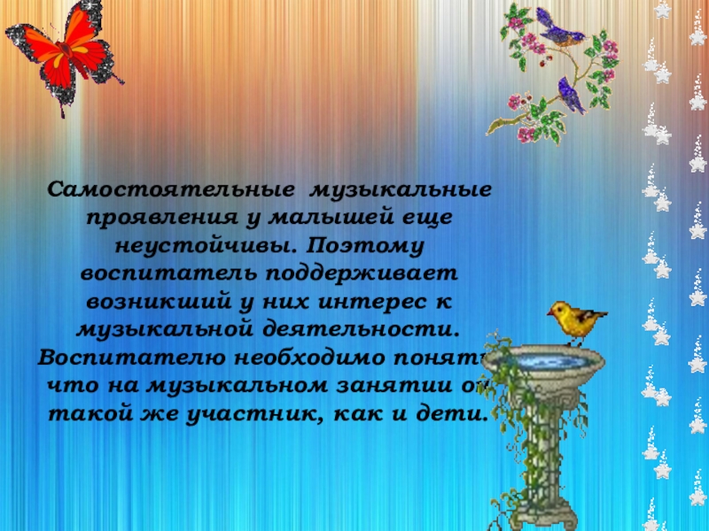 Слайд 4Самостоятельные музыкальные проявления у малышей еще неустойчивы. Поэтому воспитатель поддерживает возникший