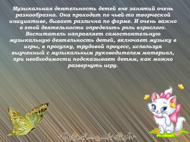Слайд 6Музыкальная деятельность детей вне занятий очень разнообразна. Она проходит по чьей-то