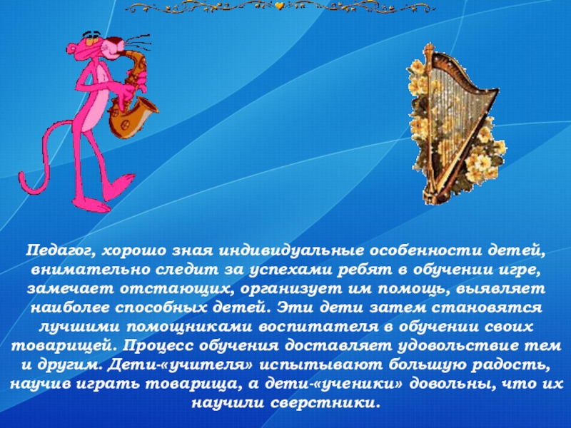 в обучении игре, замечает отстающих, организует им помощь, выявляет наиболее способных детей. Эти дети затем становятся лучшими помощниками воспитателя в обучении своих товарищей. Процесс обучения доставляет удовольствие тем и другим. Дети-«учителя» испытывают большую радость, научив играть товарища, а дети-«ученики» довольны, что их научили сверстники.